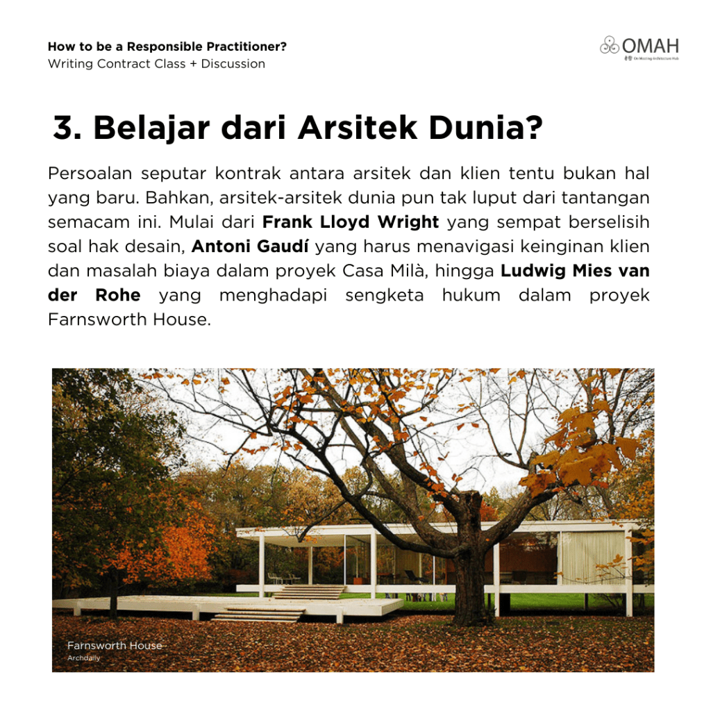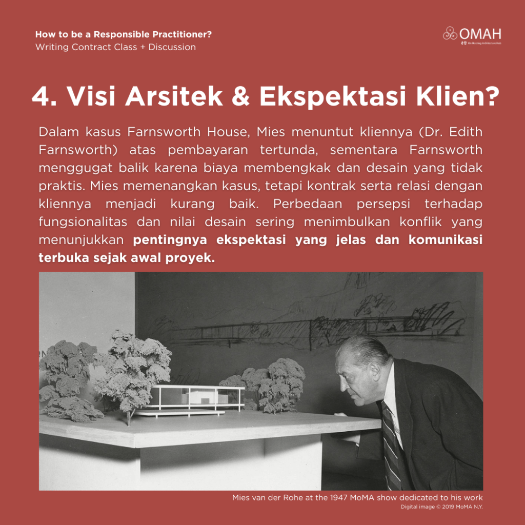 Persoalan seperti ini juga pernah dihadapi oleh para arsitek dunia. Seperti Mies van der Rohe dalam proyek Farnsworth House, yang bersengketa dengan kliennya soal biaya dan fungsi desain. Mies menang secara hukum, namun relasi mereka memburuk. Hal ini mengajarkan kita pentingnya ekspektasi dan komunikasi sejak awal.