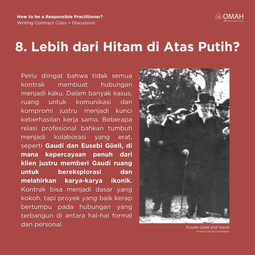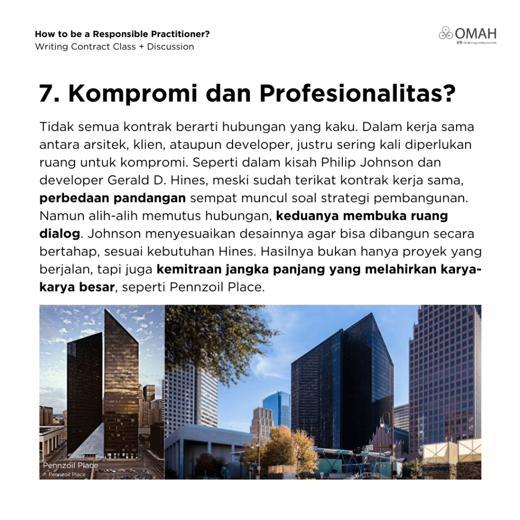 Namun, kontrak tak selalu berarti aturan yang kaku. Philip Johnson dan Gerald Hines (developer) sempat berselisih soal strategi pembangunan. Namun alih-alih memutus hubungan, keduanya membuka ruang dialog hingga akhirnya melahirkan banyak karya-karya besar seperti Pennzoil Place. Begitu juga dengan relasi Gaudí dan Eusebi Güell, di mana kepercayaan penuh dari klien justru memberi Gaudí ruang untuk bereksplorasi dan melahirkan karya-karya ikonik. Kontrak adalah fondasi yang kuat, tapi proyek yang baik juga lahir dari hubungan yang saling menghargai.