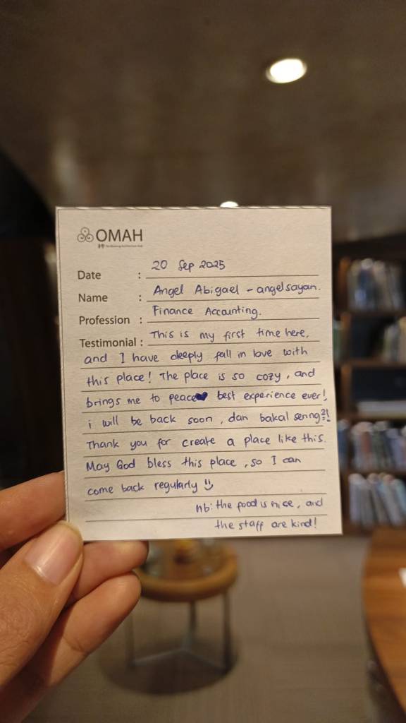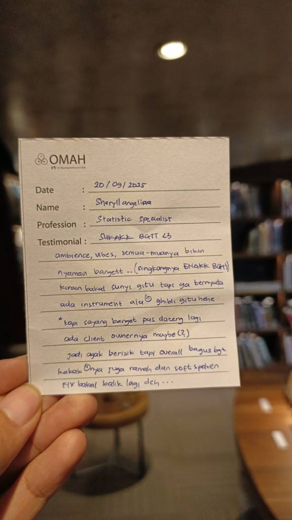 This is my frist time here, and i have deeply fall in love with this place ! The place is so cozy dan brings me to peace best experience ever ! I will be back soon. Dan bakal sering ”. Thank you for create a place like this. may god bless this place, so i can come back reularly “).