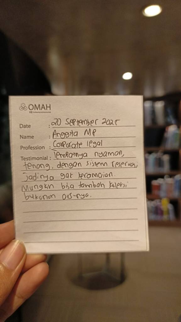 Tempatnya nyaman, tenang, dengan sistem reservasi jadinya gak keramaian, mungkin bisa tambah koleksi buku non ars-nya.