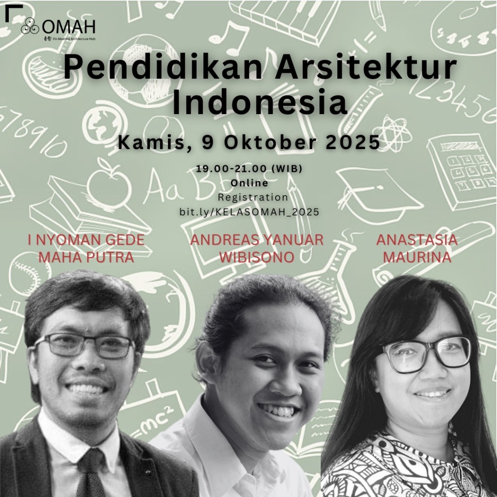 OMAH Library dengan bangga mengadakan Series Pendidikan Arsitektur Indonesia, sebuah kelas diskusi untuk menggali dan mengarsipkan pemikiran-pemikiran kunci tentang pendidikan arsitektur di Indonesia hari ini. Kami menghadirkan para Ketua Program Studi Arsitektur dari tiga universitas, yang akan berbagi pendidikan, strategi, tantangan, kurikulum, dan inovasi dalam dunia pengajaran arsitektur. Sesi ini menghadirkan tiga figur penting: