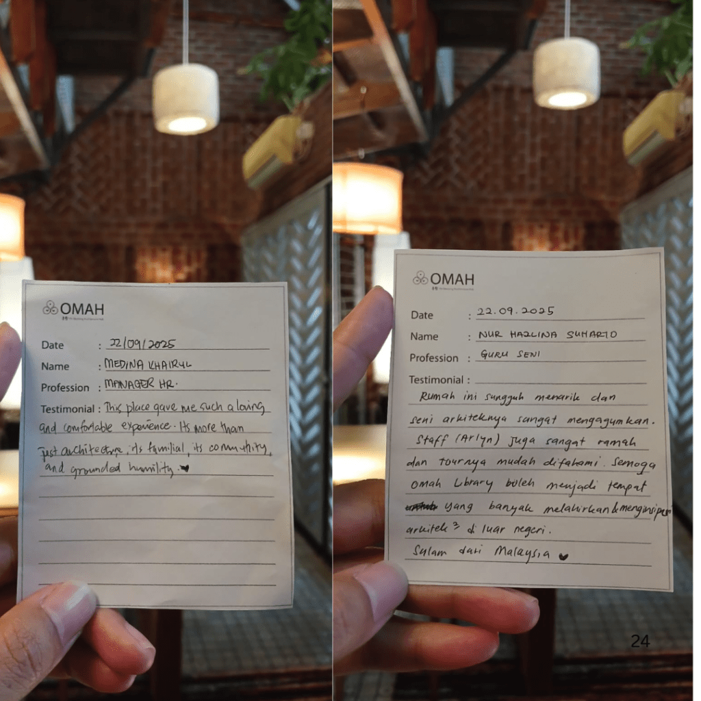 Kak Medina menuliskan kesannya, “This place gave me such a loving and comfortable experience. It’s more than just architecture, it’s familial, its community, and grounded humility.” Baginya, setiap ruang yang dilalui menghadirkan keakraban yang sulit dijelaskan, rasa yang tumbuh bukan dari bentuk, tetapi dari kebersamaan dan ketulusan yang ia rasakan.