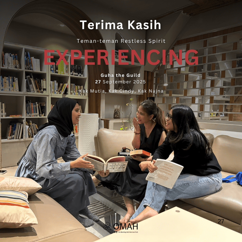Omah Library kedatangan tiga sahabat Restless Spirit dari tim @archify.id : Kak Mutia @mutiaaudina , Cindy @cndyds dan Najna @kkkunay . Ternyata mereka memiliki latar belakang yang cukup bervariasi tetapi dipertemukan oleh ketertarikan mereka pada dunia arsitektur dan desain. Dalam kesehariannya di Archify mereka menulis dan mengulas karya arsitek, artikel desain, hingga produk arsitektur, dan kali ini kedatangan mereka ke Guha menjadi proses kami belajar bersama bagaimana melihat arsitektur dari sisi pengulas, bagaimana arsitektur hanya menjadi satu pintu untuk menembus begitu banyak lapisan kehidupan.