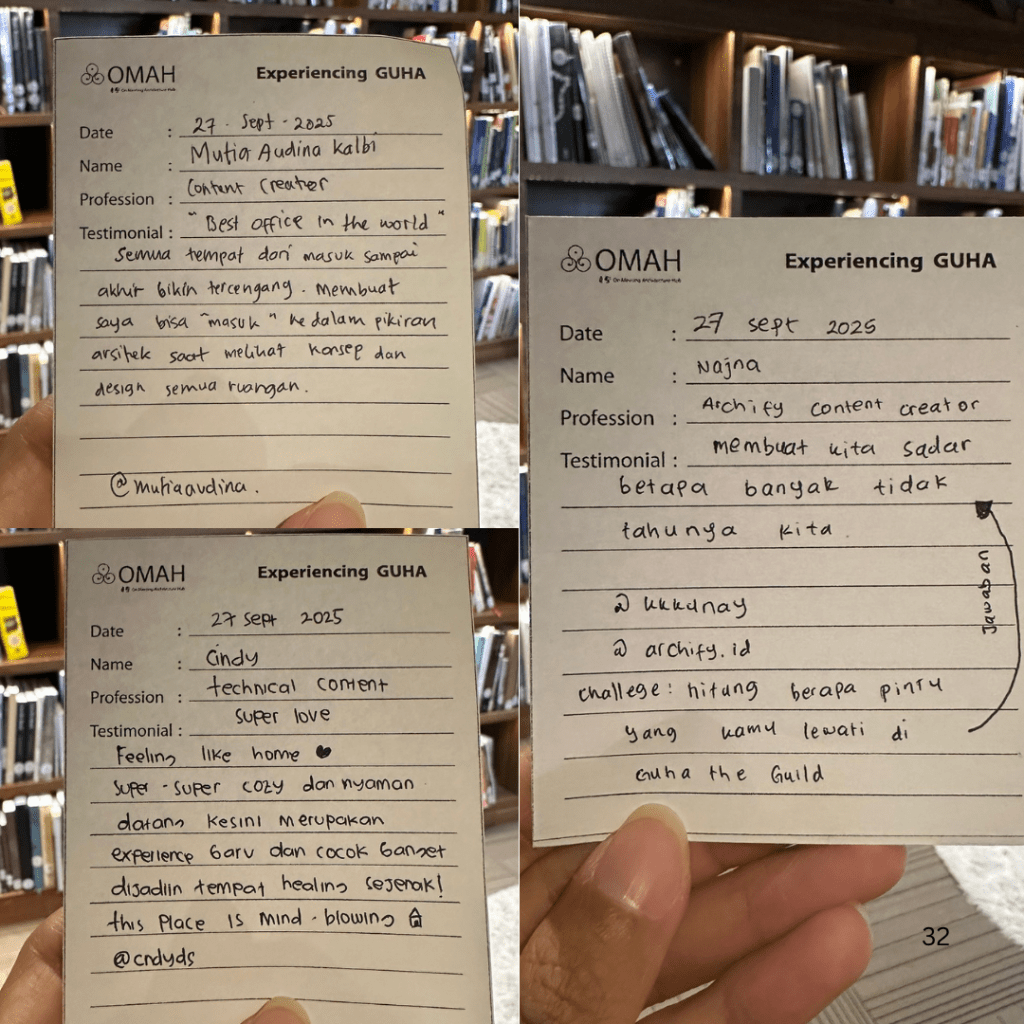 Kak Najna menuliskan, “Membuat kita sadar betapa banyak tidak tahunya kita,” Kak Mutia menyebut “Best office in the world,” karena setiap ruang membuatnya bisa “masuk” ke dalam pikiran arsitek yang merancangnya. Sementara Kak Cindy menyebut guha “super cozy dan mind-blowing”.