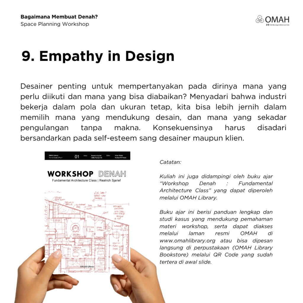 Workshop Denah ini akan diadakan pada Sabtu, 1 November 2025, pukul 10.00–12.00 WIB secara Offline dan Online di OMAH Library. Kemudian akan dilanjutkan dengan Workshop Bagaimana Membuat Tampak? Bersama Undi Gunawan pada pukul 13.00-15.00.