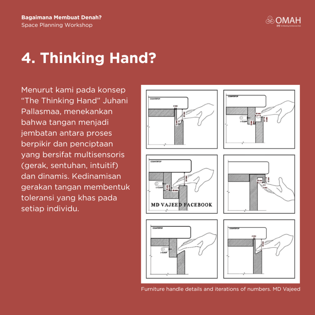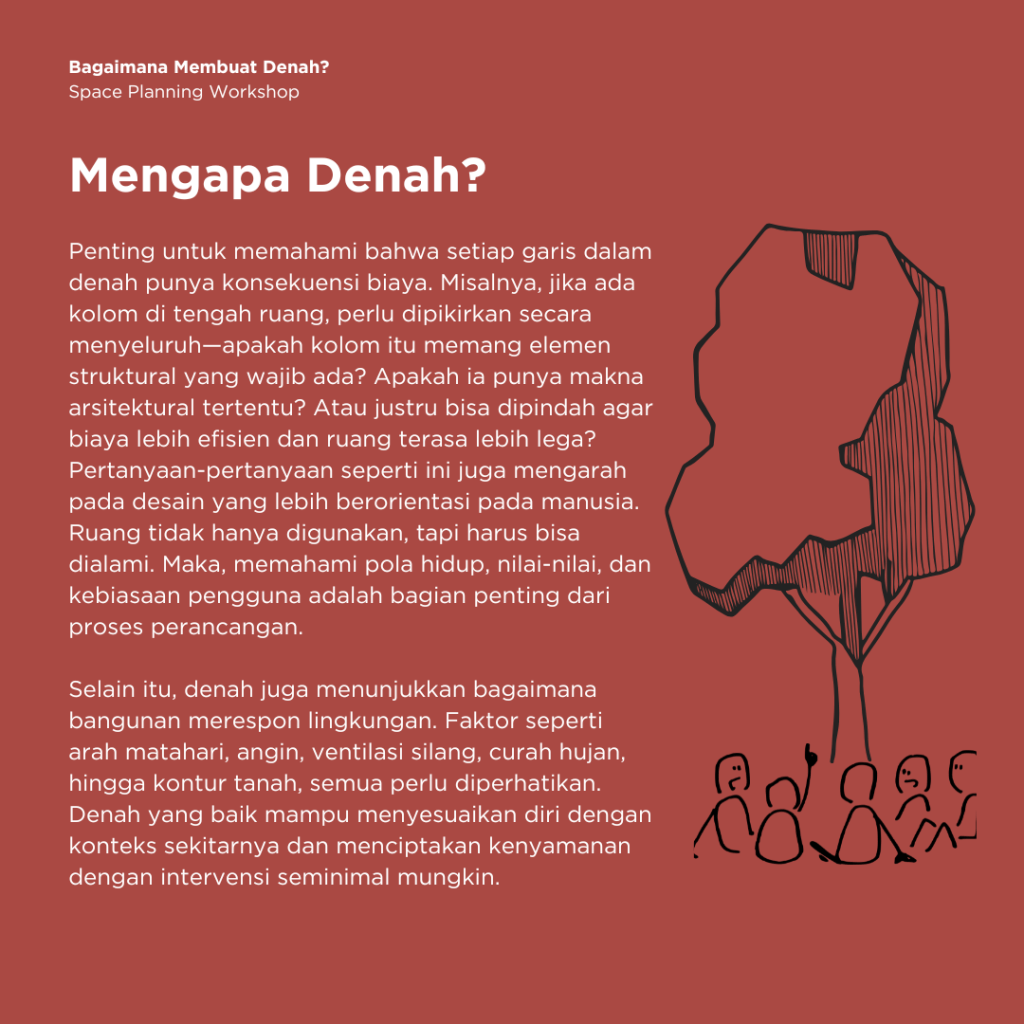 Setelah tiga workshop sebelumnya, kini Kelas-Workshop Denah kembali untuk membahas pentingnya ergonomi, efisiensi ruang, juga menyelami bagaimana denah bisa menjadi alat berpikir yang performatif, fungsional, dan kontekstual. Bersama-sama, kita akan belajar dan berdiskusi mengenai konteks lingkungan dan kebutuhan pengguna agar ruang yang dirancang benar-benar hidup dan fungsional. Setiap garis dalam denah juga membawa konsekuensi, mulai dari aspek struktur, biaya, fungsi, hingga nilai emosional yang dirasakan penggunanya.