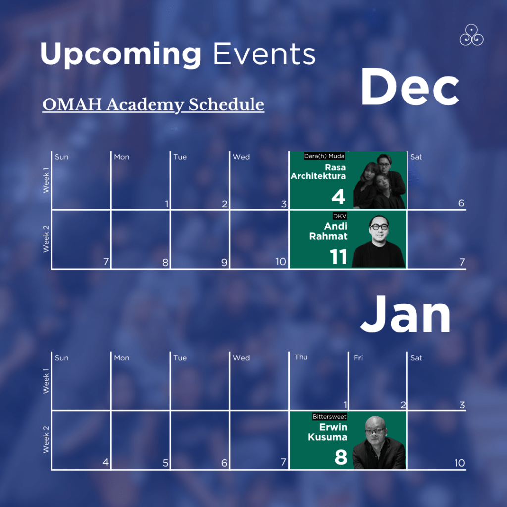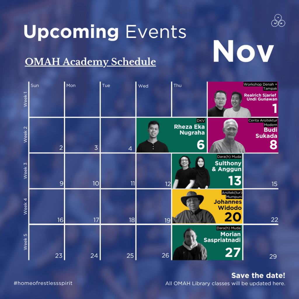 Saat ini, OMAH Library memiliki beberapa seri kelas seperti Darah Muda, Bittersweet Memories in Design Experience, Arsitektur Mumpuni dan berbagai series kelas lainny. berikut beberapa update untuk schedule event di OMAH Library.