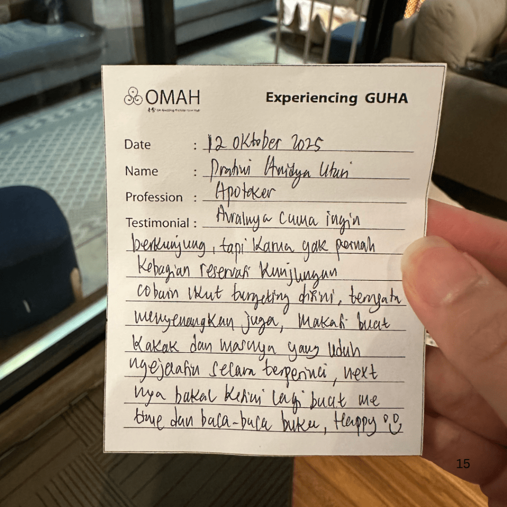 Bagi Kak Pratiwi, ruang-ruang di Guha bukan sekadar tempat, tapi pengalaman yang hidup. Di antara udara hangat, aroma tanah, dan cahaya sore yang jatuh lembut, ia menemukan ketenangan yang tidak dibuat-buat. Sebelum pulang, ia berkata ingin kembali lagi, bukan untuk hal besar, hanya untuk duduk diam, menyeruput teh, dan membaca buku perlahan.