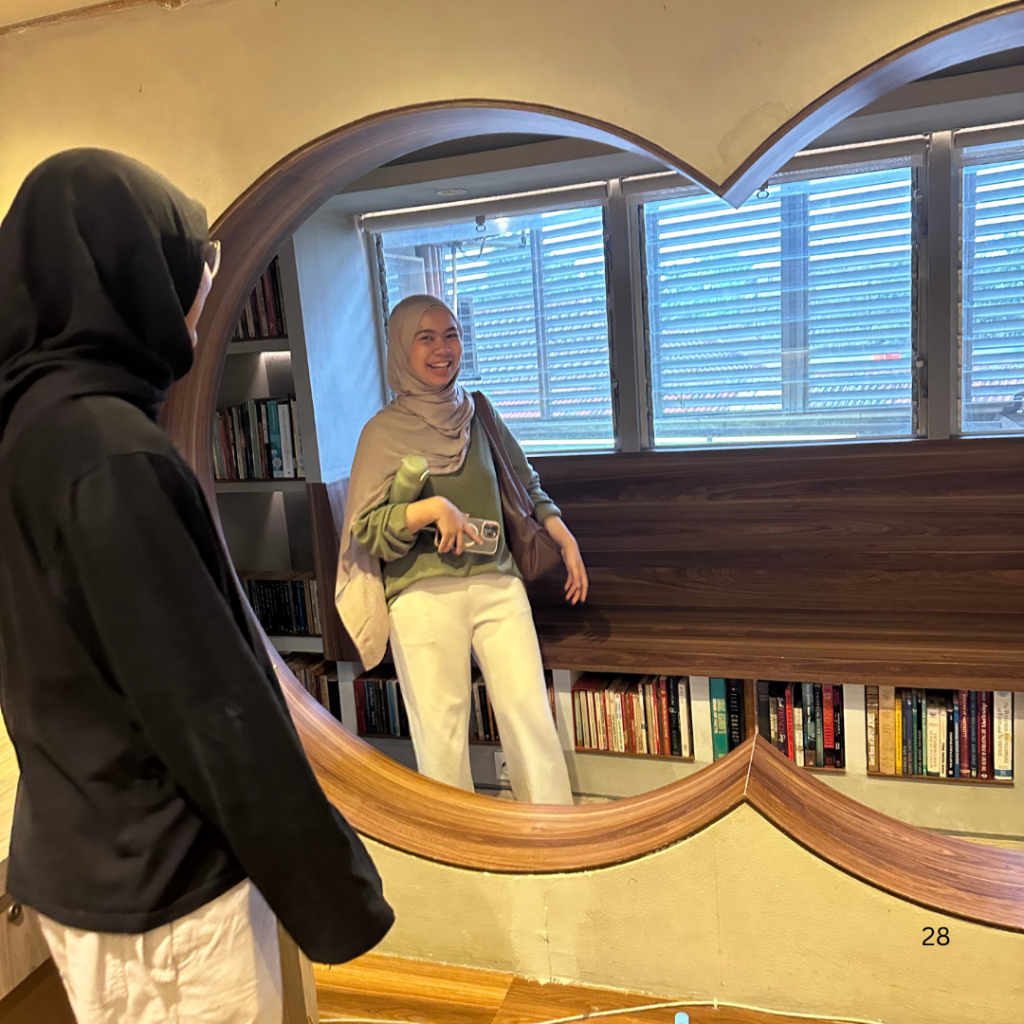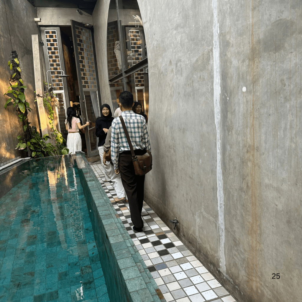 Kak Qonita dan Kak Ken, dua kawan yang datang untuk menikmati akhir pekan mereka. Seperti melihat dua kawan lama yang sedang menemukan kembali memori dan percakapan lama—tentang ide, tentang rasa ingin tahu, tentang hal-hal kecil yang sering terlewat dalam kesibukan. Mereka berjalan perlahan, berhenti di setiap sudut, memperhatikan bagaimana cahaya bergerak, bagaimana ruang berbicara tanpa suara, sambil mengenang memori pertemanan mereka.