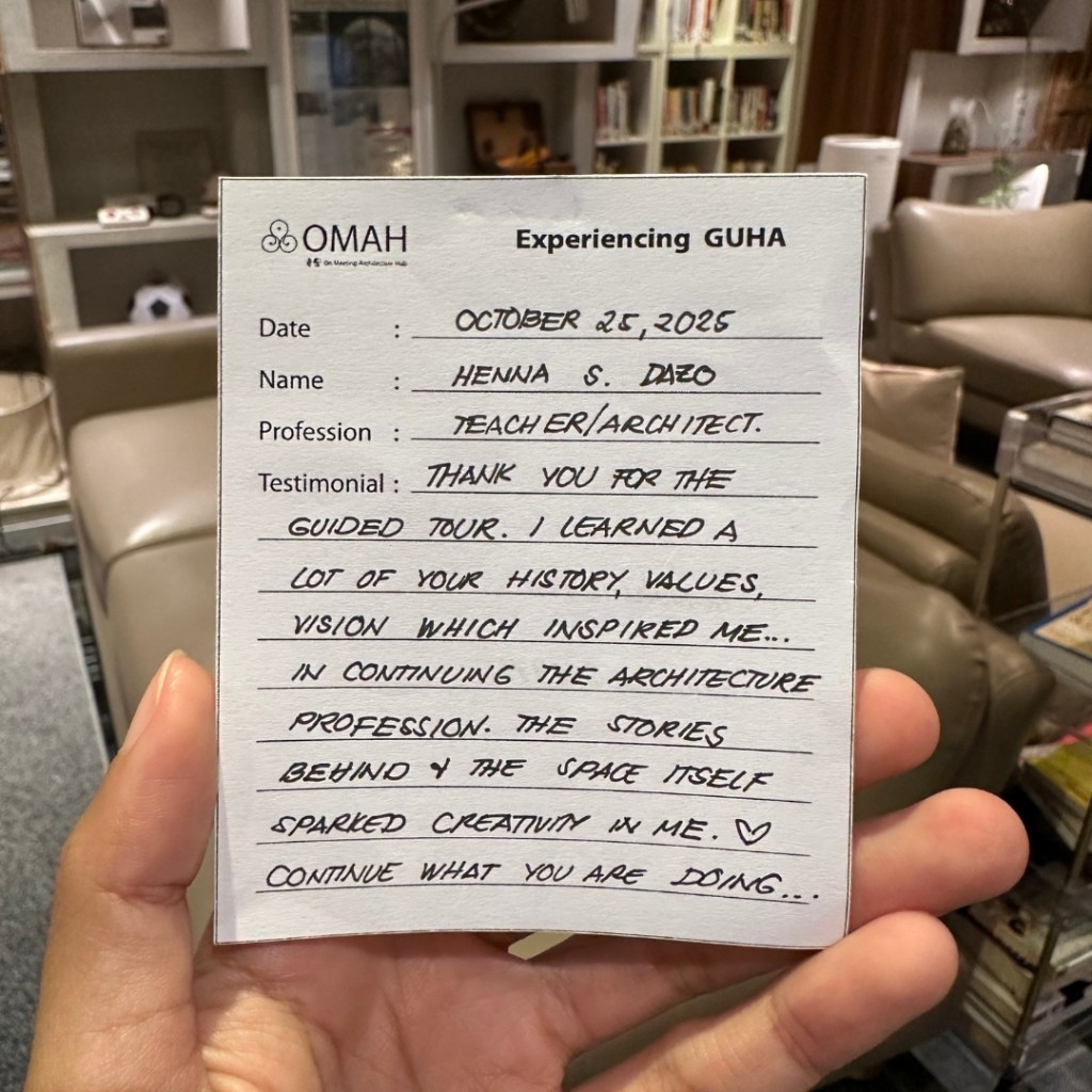Ia bercerita bahwa arsitektur tradisional Filipina masih minim dokumentasi. Banyak bentuk, ruang, dan pengetahuan lokal yang sebenarnya sangat kaya, tetapi belum banyak dituliskan. Cerita itu terasa dekat dengan pengalaman OMAH Library—bagaimana nilai-nilai desa dan tradisi lama terus berusaha dijaga sambil perlahan melebur dengan arsitektur perkotaan.
