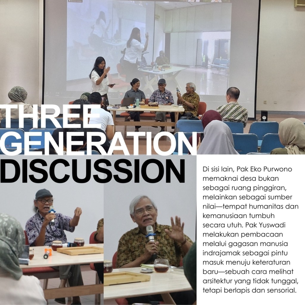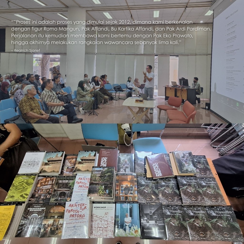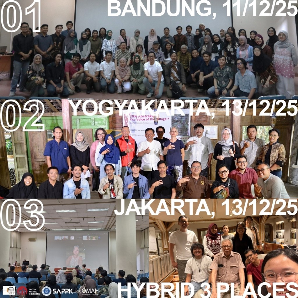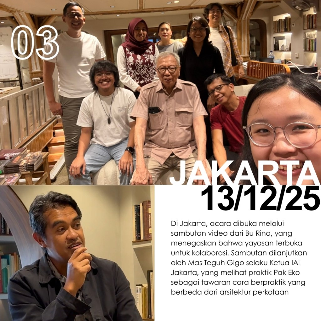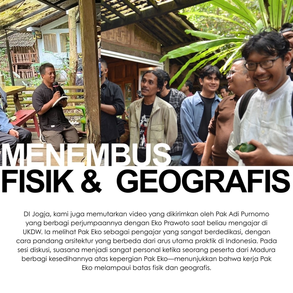 Di tiga kota ini, para penanggap hadir untuk membagikan kisah juga kesan terhadap buku The Voice of the Village: Eko Prawoto. Pemikiran Pak Eko Prawoto dibaca ulang, tidak untuk dibakukan, melainkan untuk terus dipertanyakan dan diteruskan. Yang tersisa bukan sekadar rangkuman karya, tetapi jejak sikap: keberpihakan pada manusia, kepekaan pada konteks, dan kesetiaan pada proses. Harapannya, semangat Pak Eko Prawoto bisa terus hidup dalam cara kita belajar, bersikap, dan mempraktikkan arsitektur dengan rendah hati dan manusiawi.
