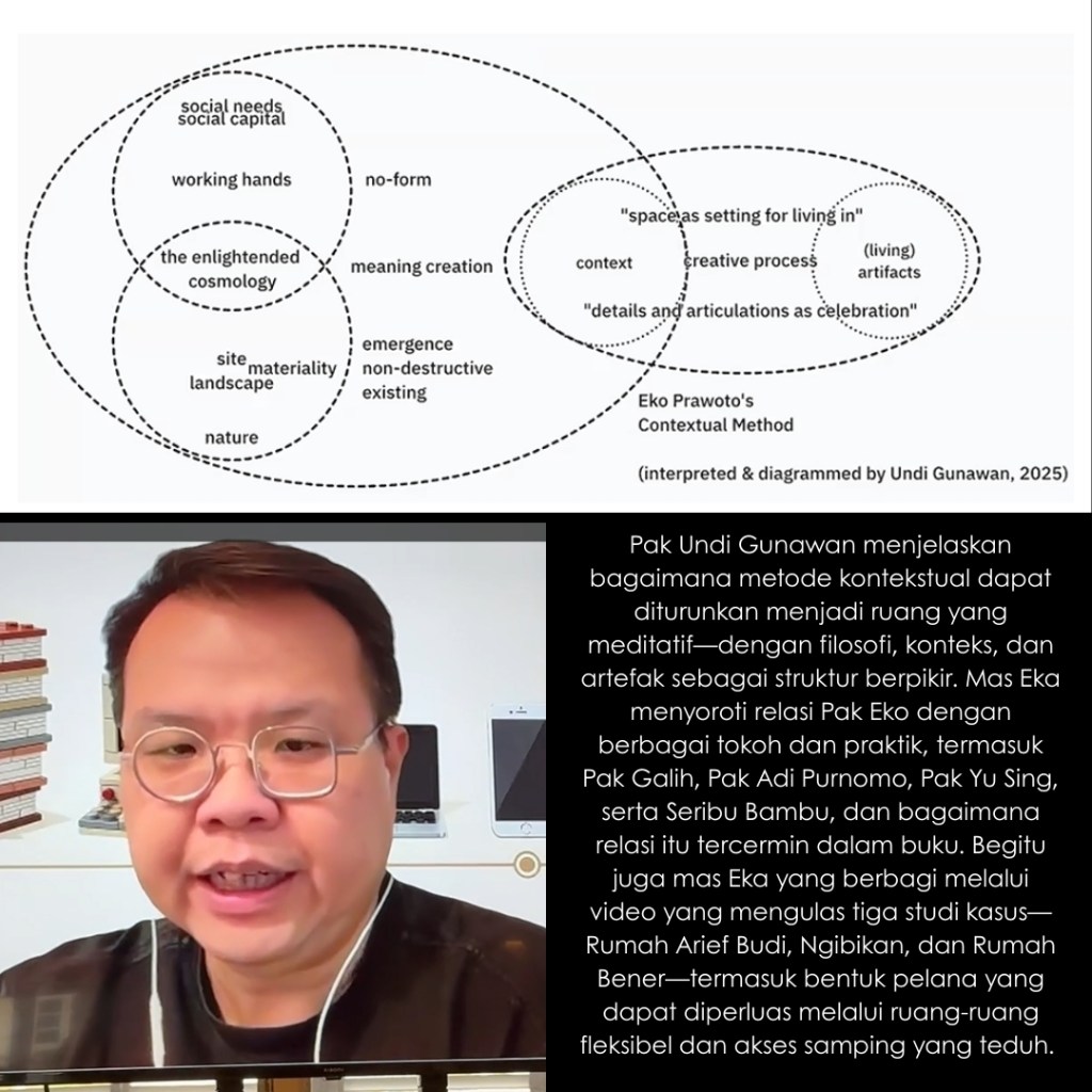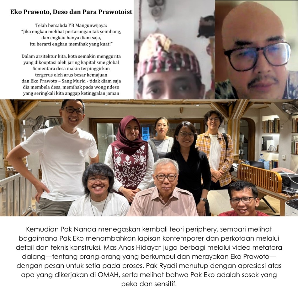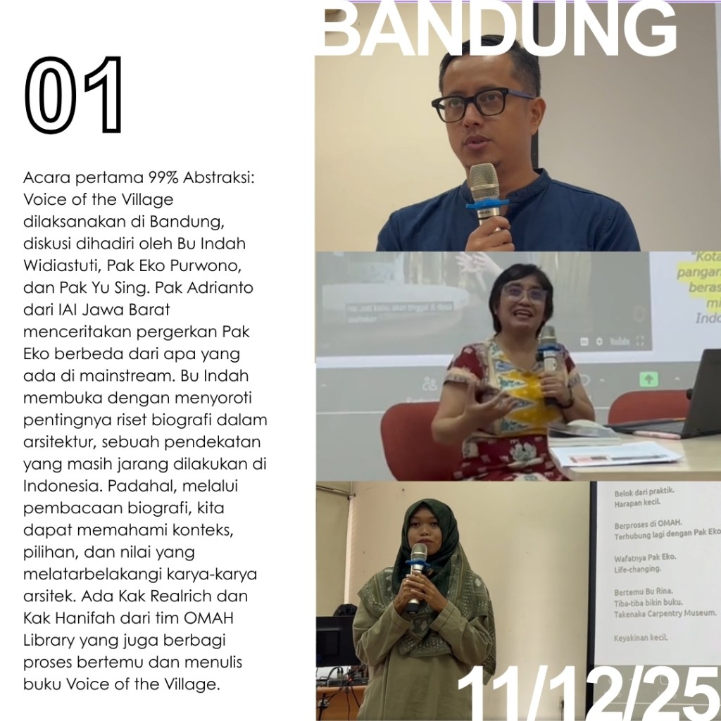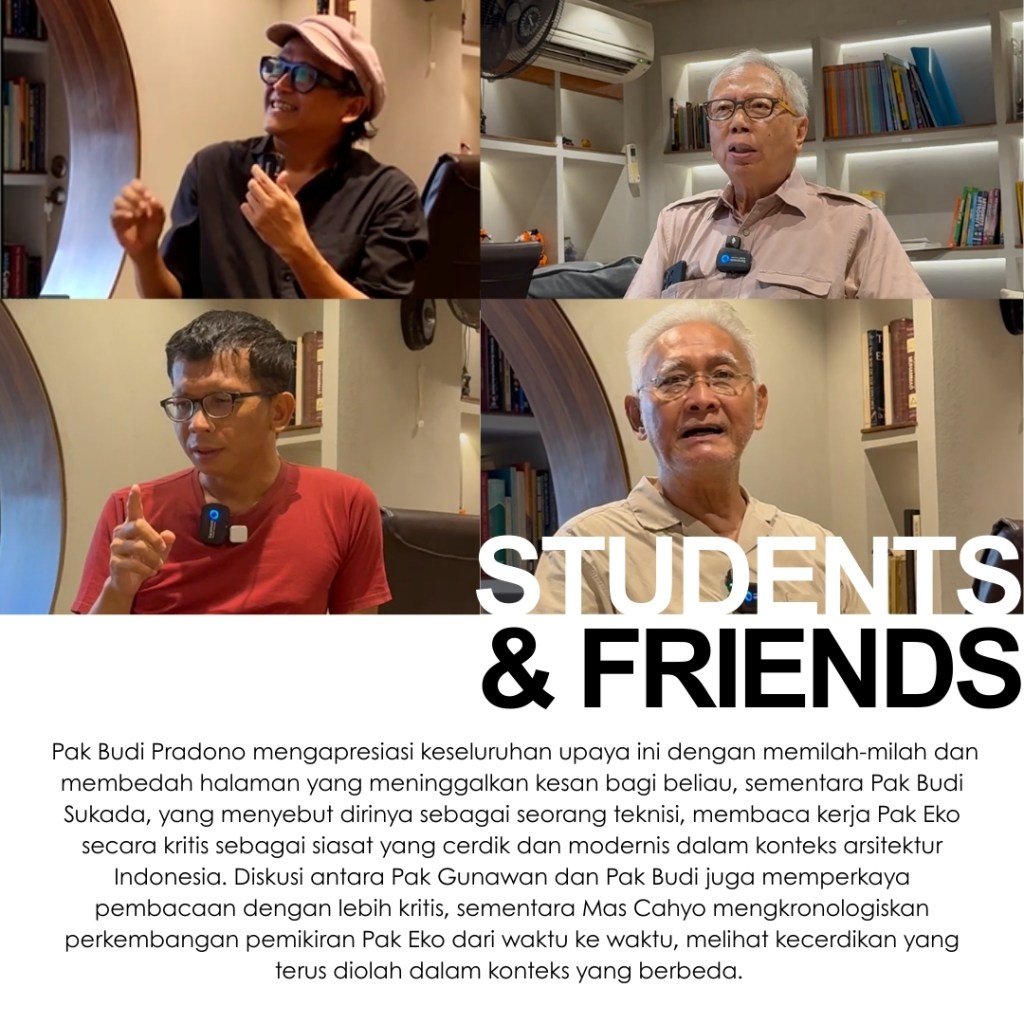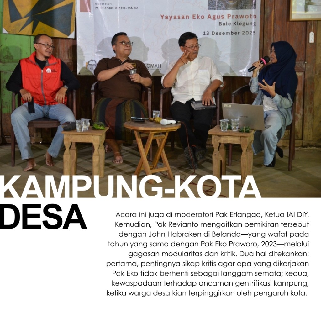 Di tiga kota ini, para penanggap hadir untuk membagikan kisah juga kesan terhadap buku The Voice of the Village: Eko Prawoto. Pemikiran Pak Eko Prawoto dibaca ulang, tidak untuk dibakukan, melainkan untuk terus dipertanyakan dan diteruskan. Yang tersisa bukan sekadar rangkuman karya, tetapi jejak sikap: keberpihakan pada manusia, kepekaan pada konteks, dan kesetiaan pada proses. Harapannya, semangat Pak Eko Prawoto bisa terus hidup dalam cara kita belajar, bersikap, dan mempraktikkan arsitektur dengan rendah hati dan manusiawi.