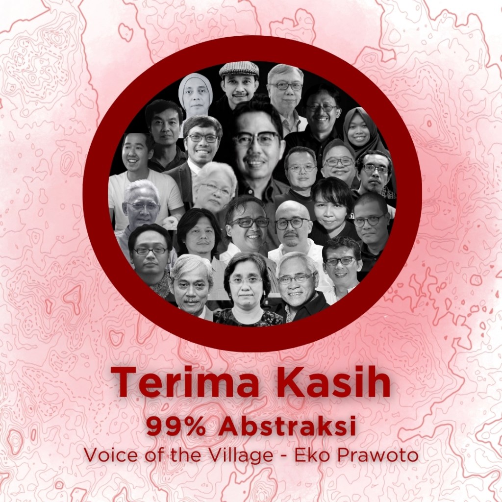 Terima kasih kepada seluruh stakeholder yang telah berperan dalam terselenggaranya rangkaian acara 99% Abstraksi. Acara ini terwujud berkat kolaborasi bersama IAI, ITB, dan Yayasan Eko Agus Prawoto (YEAP), yang digelar di tiga kota—Bandung, Yogyakarta, dan Jakarta—sebagai ruang berbagi gagasan, ingatan, dan refleksi atas pemikiran Eko Prawoto.