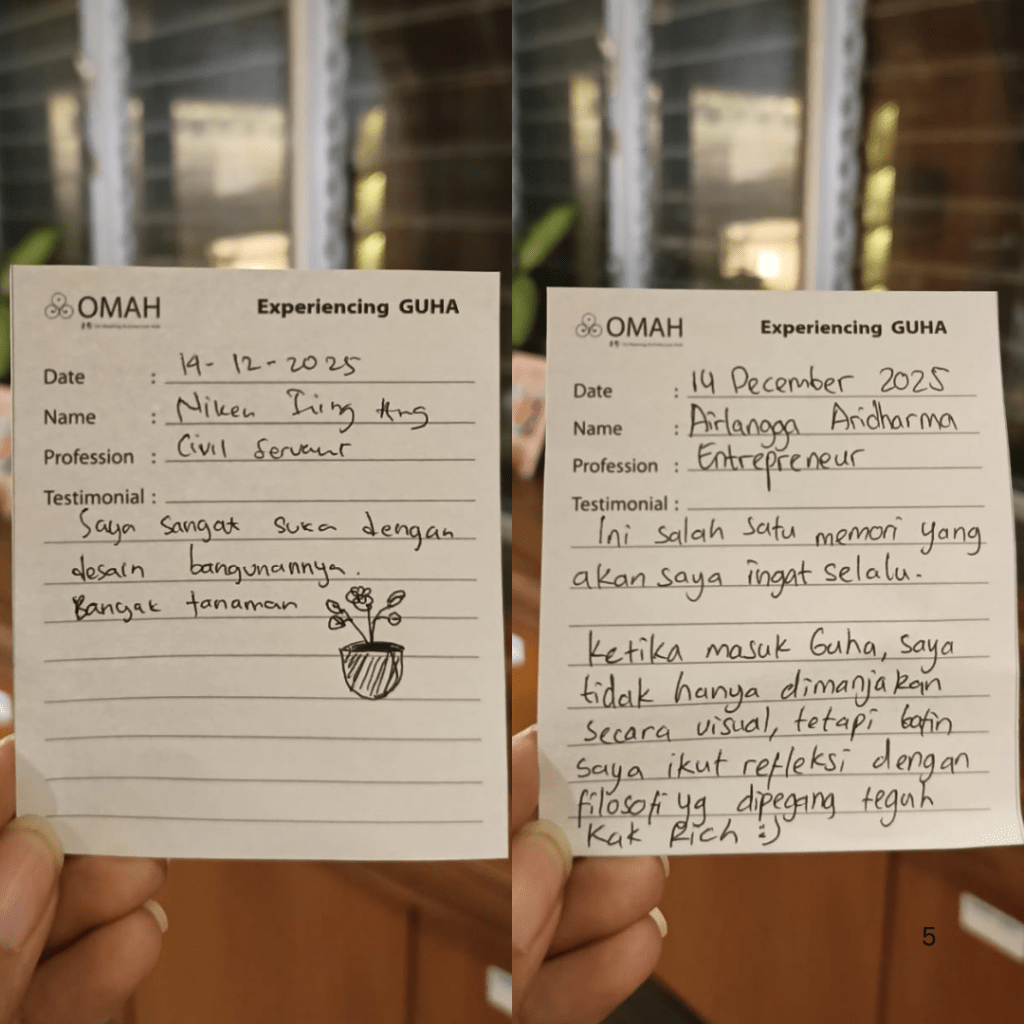 Sejak awal menelusuri Guha, ketertarikan mereka sudah terasa pada ruang, detail, dan cara sebuah rumah dibangun dengan niat yang jelas. Dari percakapan yang mengalir, mereka mencoba membaca intensi di balik desain: kepedulian pada manusia, proses, dan pada mereka yang terlibat dalam pembangunannya.