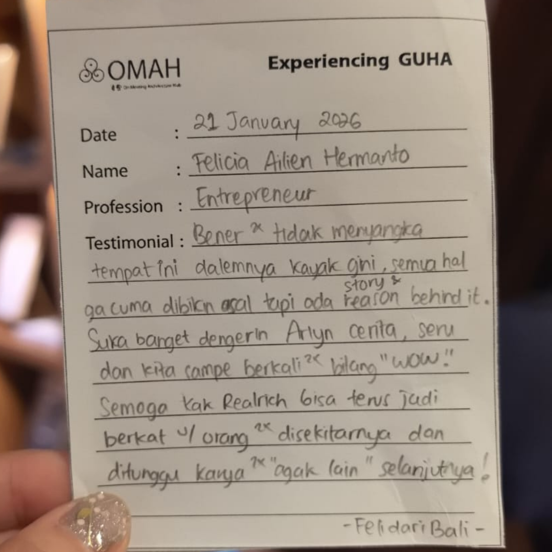 Kunjungan kali ini mempertemukan kami dengan Kak Felicia dan Kak Charles yang datang jauh-jauh dari Bali pada 21 Januari lalu. Mereka memiliki kebiasaan baru, yaitu membaca. Dari kebiasan baru itu mereka jadi penasaran ruang seperti apa yg baik untuk membaca. Dari rasa ingin tahu tentang tempat membaca hingga cara merancang ruangnya, langkah mereka akhirnya membawanya ke Guha The Guild untuk experiencing.
