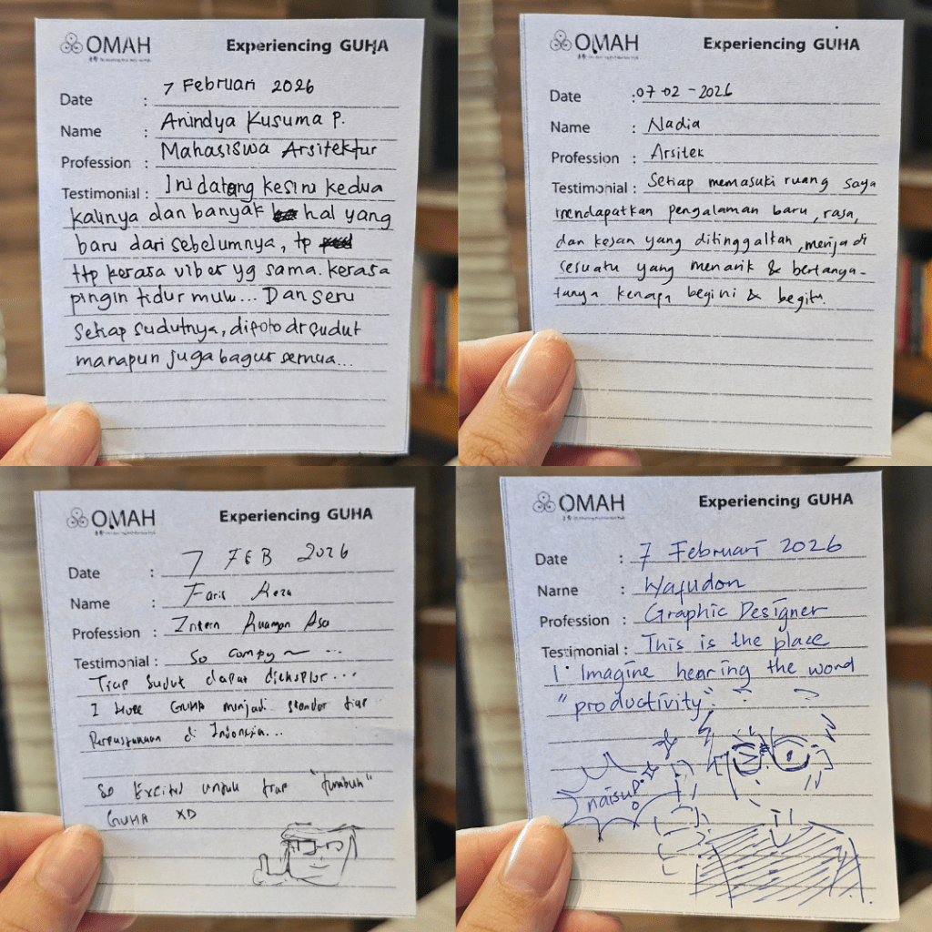 Beberapa dari mereka menyampaikan bahwa setiap ruang memberikan pengalaman yang berbeda. Ada yang merasa ruang-ruang di Guha begitu nyaman untuk berlama-lama, ada pula yang melihatnya seperti labirin penuh cerita yang bisa dieksplor dari berbagai sudut.