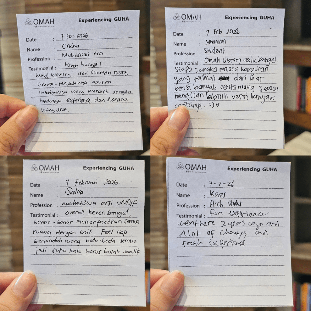Di akhir Experiencing, beberapa teman juga membagikan kesan mereka. Anindya menyebutkan bahwa ini adalah kunjungan keduanya dan meskipun banyak hal baru, vibe yang sama tetap terasa—hangat dan menyenangkan untuk dijelajahi. Nadia juga berbagi bahwa setiap ruang menghadirkan rasa dan pertanyaan baru tentang bagaimana ruang itu dibentuk. Faris menambahkan bahwa Guha terasa sangat nyaman untuk dieksplorasi dan ia berharap pengalaman ruang seperti ini bisa menjadi inspirasi bagi perpustakaan di Indonesia.