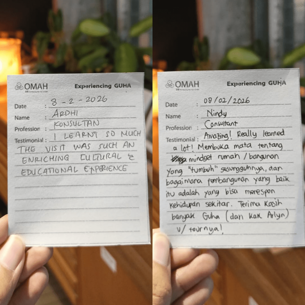 Banyak pertanyaan muncul, mulai dari sisi teknis pemanfaatan material, pemanfaatan cahaya dan udara alami dan pendekatan keberlanjutan yang diterapkan di Guha. “Amazing, really learned a lot, membuka mata tentang mindset rumah yang ‘tumbuh/bangunan’ yang tumbuh sesungguhnya, dan bagaimana pembangunan yang baik itu adalah, yang mampu merespon kehidupan sekitar,” ujar Kak Nindy. Sementara Kak Ardhi menambahkan bahwa kunjungan ini menjadi pengalaman yang kaya, “i learnt so much the visit was such an enriching cultural and educational experience”.