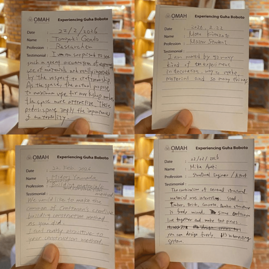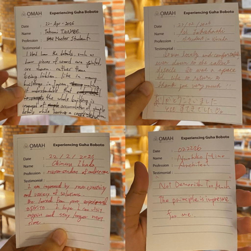 At Piyandeling, conversations ranged from building processes and techniques to the relationships embedded within them, including exchanges with craftsmen alongside Pak Sani’in. Meanwhile, at Guha the Guild, they engaged with explanations on space and concept shared by Kak Rich, before continuing the journey to Guha Boboto. Questions emerged around the relationships between space, family, craftsmen, and the surrounding context, including how OMAH Library and Guha came to exist.