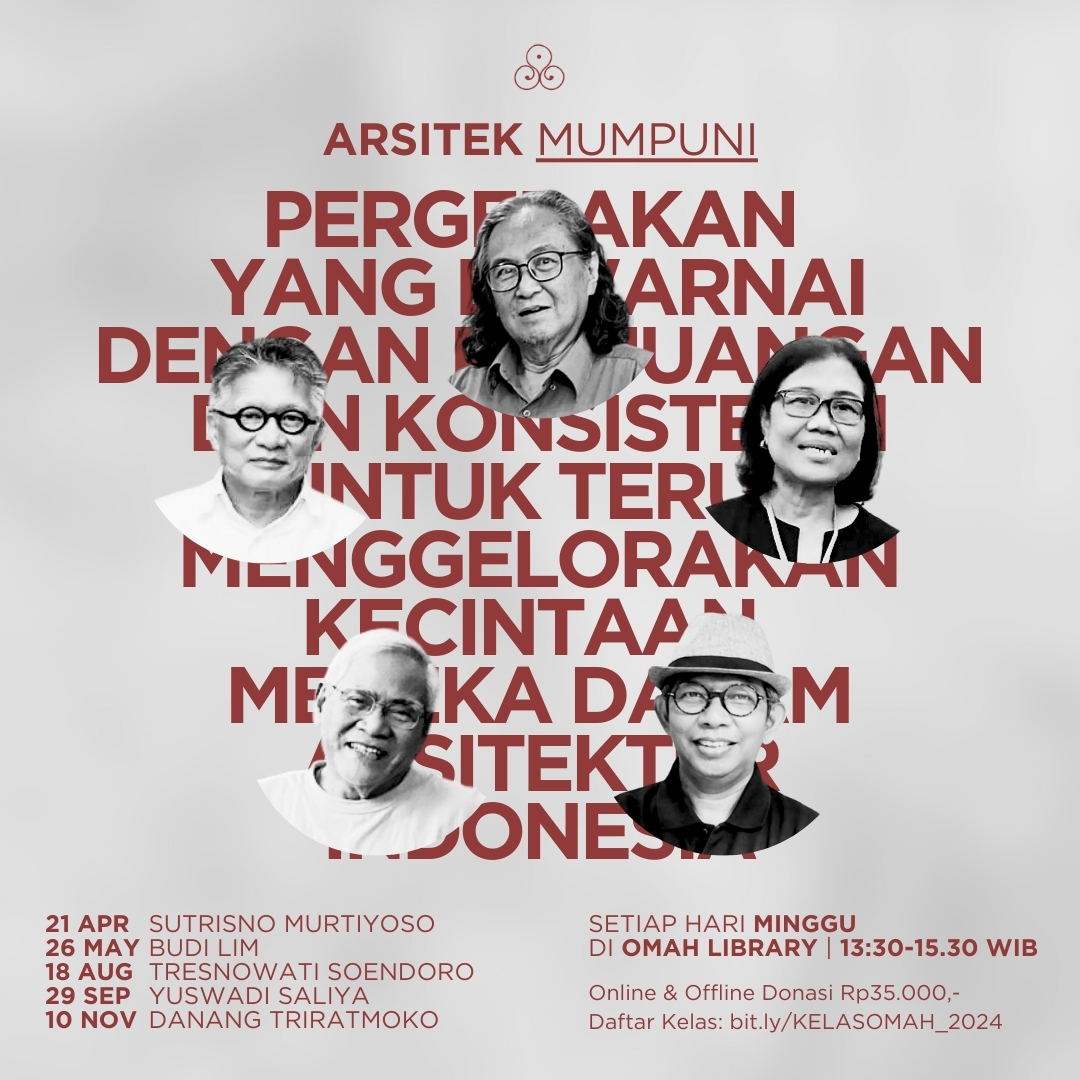 Arsitek(tur) Mumpuni merupakan salah satu series lecture di OMAH Library. Pergerakan arsitektur di Indonesia salah satunya tumbuh karena perjuangan dan konsistensi arsitek-arsitek yang kami sebut “Mumpuni”. Arsitek mumpuni diwarnai dengan perjuangan yang konsisten dalam membangun ekosistem arsitektur, dan terus menggelorakan kecintaan mereka, bahwa mereka perlu berkontribusi untuk arsitektur. Mereka adalah orang-orang yang selama ini konsisten merajut arsitektur Indonesia. Seringkali orang-orang tersebut menjadi titik kembali bagi para kaum muda yang gelisah terhadap topik-topik seputar arsitektur di masa kini.