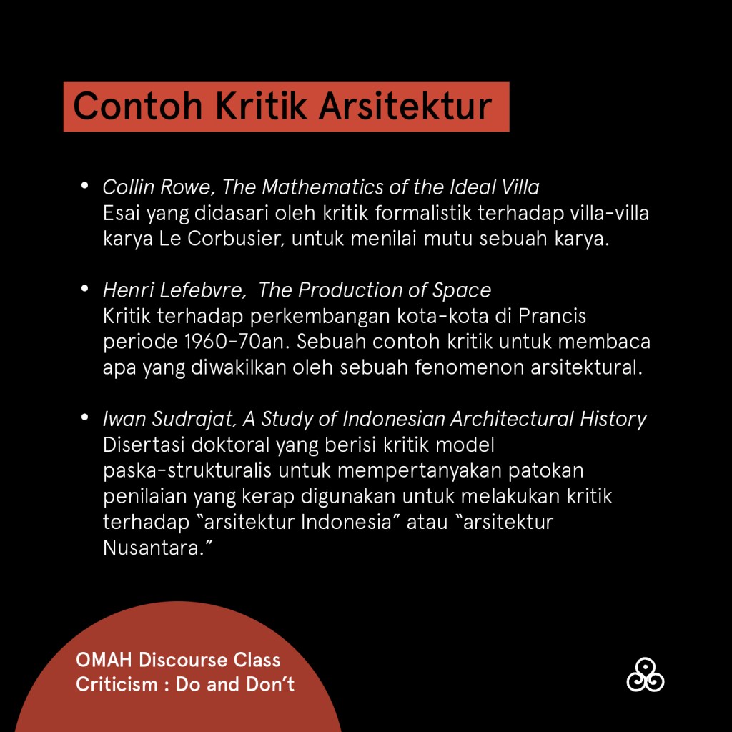 Kita kerap salah dalam memahami kritisisme. “Mengkritik” kerap kita anggap sebagai “menyerang,” “mencela,” atau “menghantam” lawan debat kita. Kesalah pahaman ini perlu diluruskan. Kritisisme adalah salah satu unsur dari tritunggal sejarah—teori—kritisisme. Kritisisme, menurut salah satu pengertian yang ditawarkan oleh Kamus Cambridge, adalah “a careful discussion of something in order to judge its quality or explain its meaning.” Melalui kritisisme kita dapat membahas karya-karya arsitektur secara diskursif. Pembahasan diskursif semacam itu akan sangat bermanfaat dalam pengembangan arsitektur sebagai sebuah disiplin.