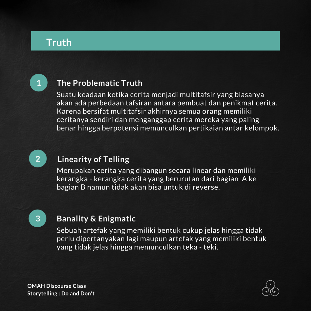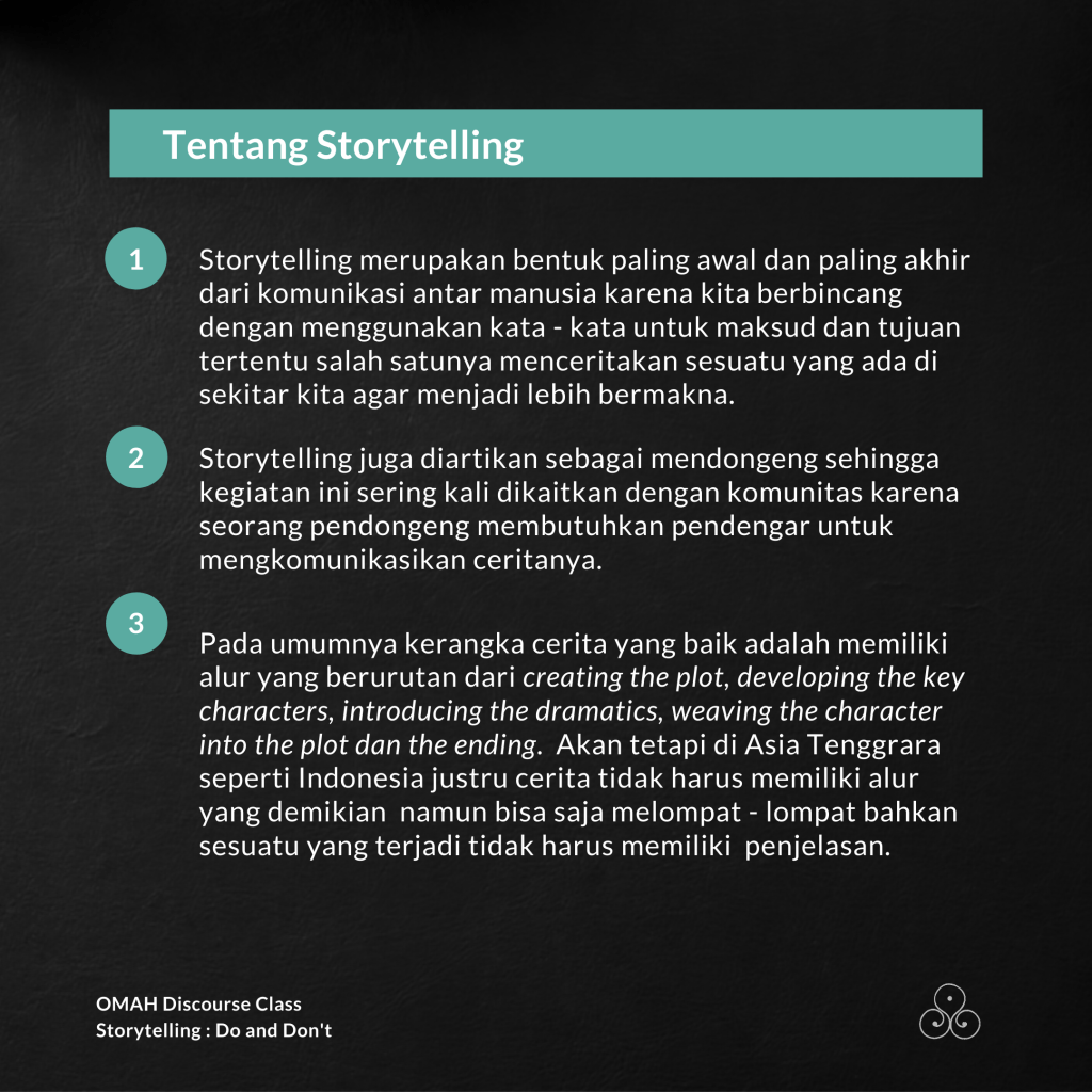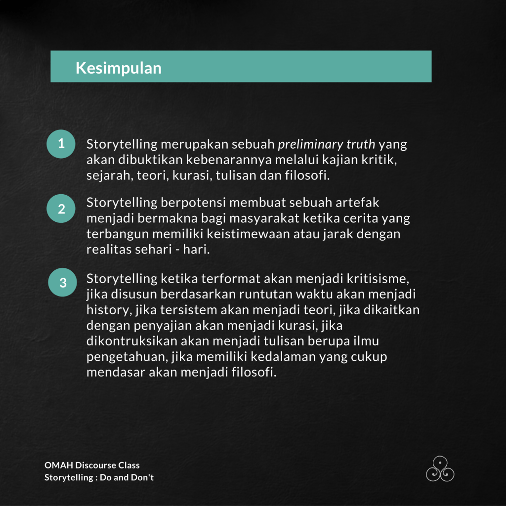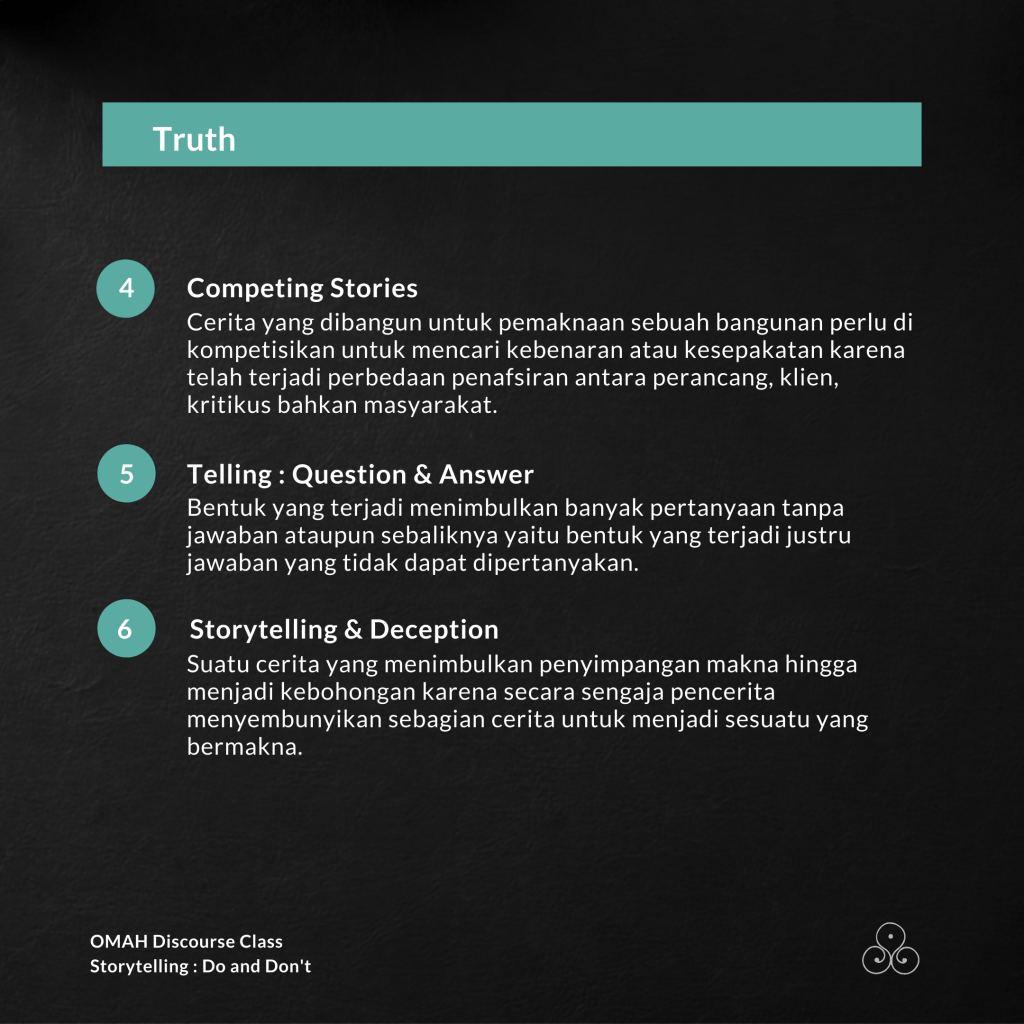 Dengan berbagi cerita maka manusia dapat menggalang solidaritas, menjalin kerjasama, serta membangun cita-cita dan idealita bersama. Budaya, bangsa dan agama adalah di antara gagasan-gagasan abstrak yang terbentuk karena kemampuan bercerita. Arsitektur menjadi perlu dibahasakan sebagai cerita ketika dia melampaui batas-batas kesehariannya. Suatu rumah bisa membuat penghuninya kerasan, tanpa perlu diceritakan kepada orang yang memang sehari-hari di situ. Tapi ketika penghuni ingin meyakinkan tentang perasaan kerasan itu kepada mereka yang tak pernah melihat dan menginap di dalamnya maka cerita diperlukan.