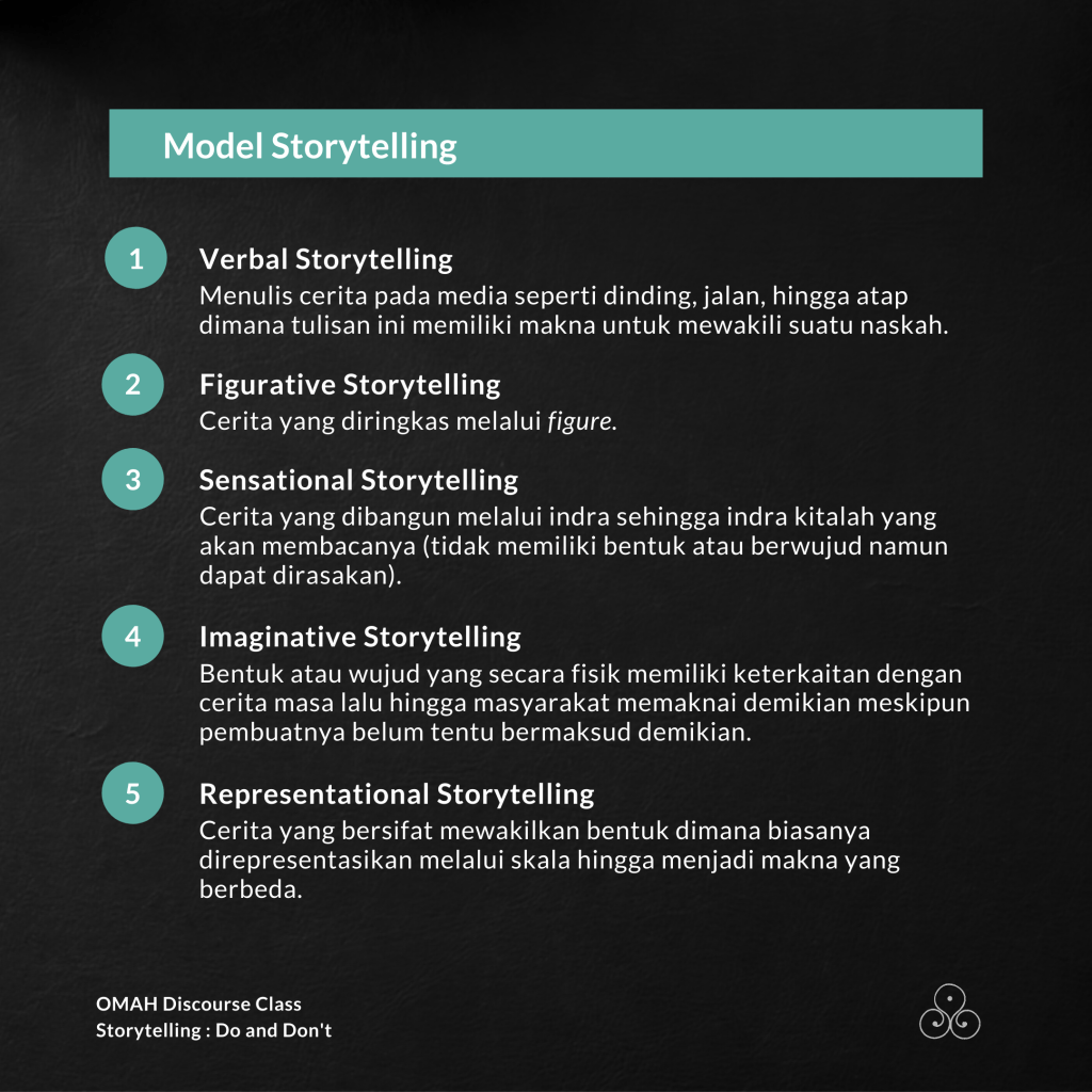 Sejumlah moda dalam membangun cerita arsitektur antara lain: a) figuratif, memberikan gambaran wujud; b) sensasional, memberikan gambaran perasaan; c) fiksional, memberikan gambaran imajinatif; atau d) representasional, memberikan gambaran tentang sesuatu selain rumah atau objek itu sendiri.